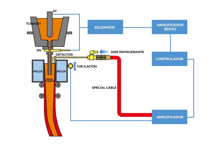 El SISTEMA DE MEDICIÓN DE NIVEL ELCM-1000 fue diseñado para usarse en el control de nivel de los moldes de metal fundido en los procesos de colada continua en la industria siderúrgica y se compone de un Detector de Nivel (Cabeza Sensora), un Amplificador de Señal y un cable dedicado de fabricación especial