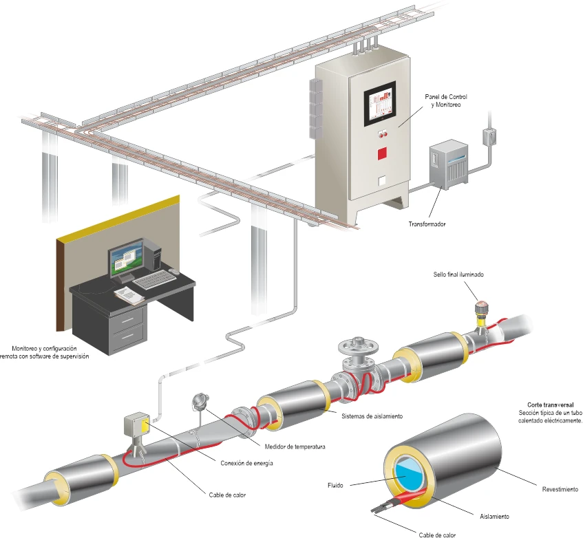 Sistemas de calentamiento por medio de cables calentadores para el mantenimiento de temperatura en línea de proceso.